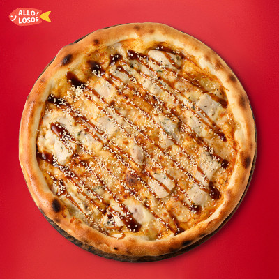 Курка маринована, томатний піца-соус, сир «Моцарелла», «Теріяки» соус, кунжут білий. Бортики змащуються часниковим маслом.