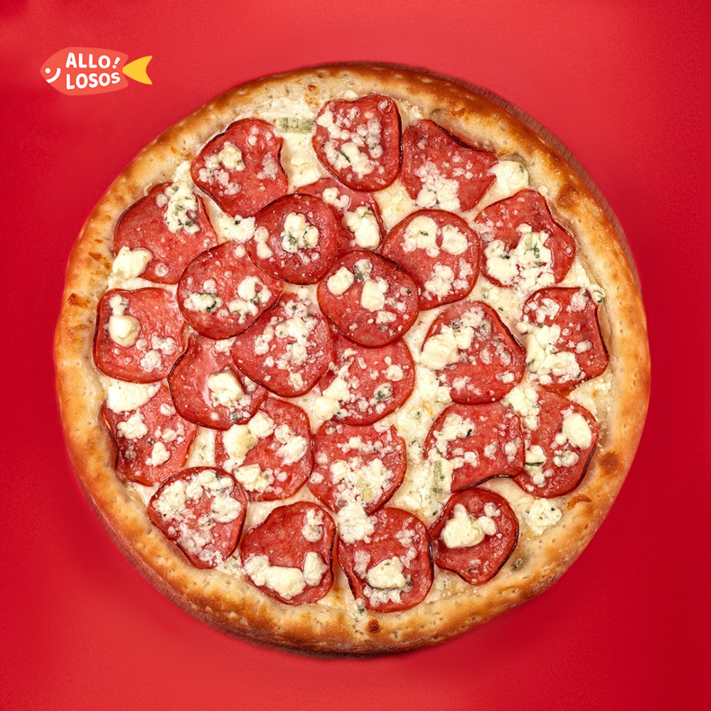 Салямі, сир "Дор Блю", сир "Моцарелла", Вершкова основа. Бортики змащуються часниковим маслом.