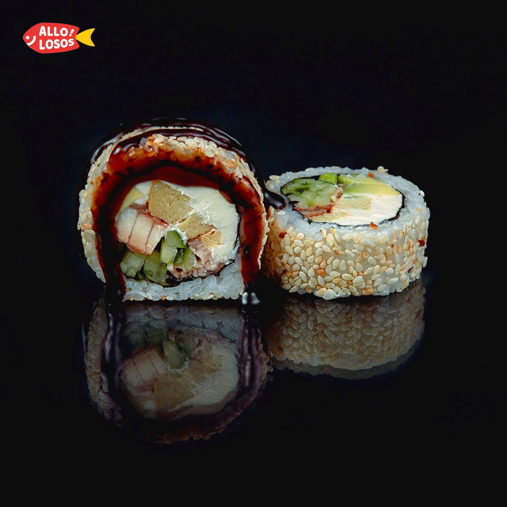 Рис, норі, сир «Філадельфія», вугор, томаго, авокадо, огірок, кунжут, соус «Унагі», 8 шт.
