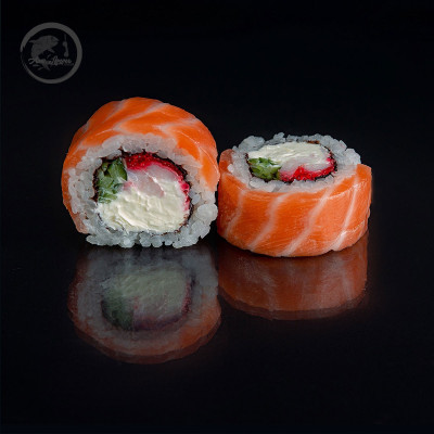 Рис, нори, лосось слабосоленый, креветка, сыр «Филадельфия», икра летучей рыбы (цвет может отличаться), огурец, 8 бочонков