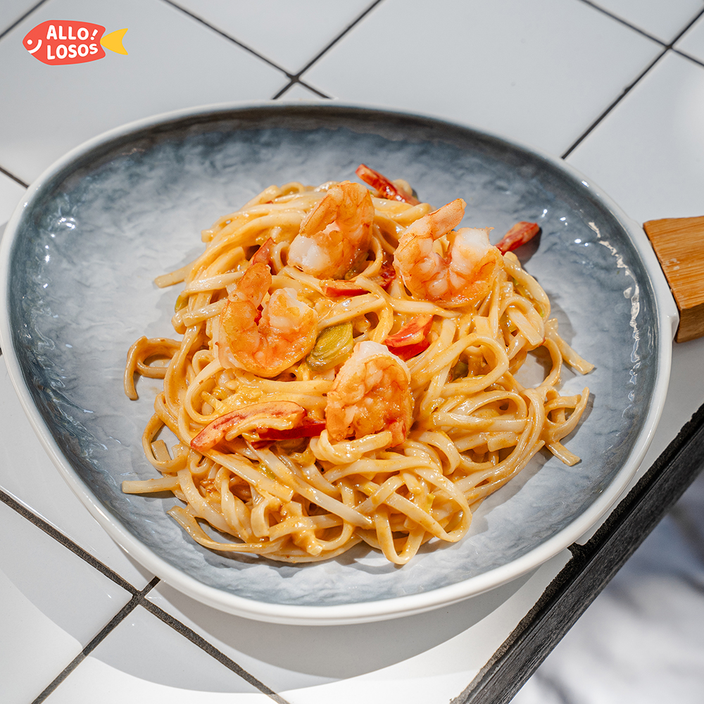 Лапша Удон, Тигровая Креветка, болгарский перец, лук порей, сливки, паста "Том Ям", перец чили, кунжутное масло, лайм.
